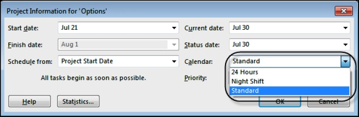 ❖ Check the Project Calendar in the PROJECT, Project, Project Information… form,