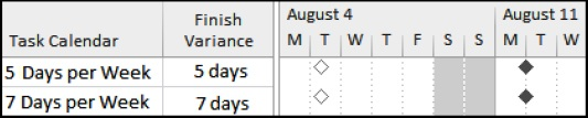 Note: When you need to calculate a milestone variance in calendar days, it is best to place the milestone on a 7-day per week calendar without holidays to ensure the Variance calculates the elapsed duration.