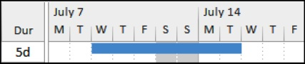 ❖ Therefore, a five-day duration task with a five-day workweek calendar, starting Wednesday, with Saturday and Sunday as non workdays, will finish at the end of the workday on the following Tuesday, see the picture below: