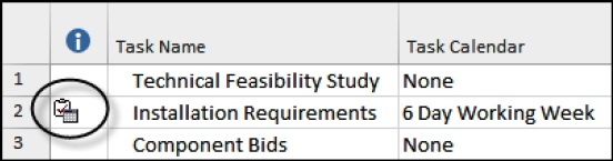 After a calendar has been assigned, an icon will appear in the Indicators column and the calendar name displayed in the Task Calendar column, as shown in the picture below for the Installation Requirements task: