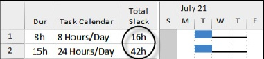 ❖ The task Finish date, Total Float, Free Float and Variances from a Baseline will be calculated on the Task Calendar. This often leads to confusion for new users as tasks on a 24-hour/day calendar will have different Float than tasks on an 8-hour/day calendar.
