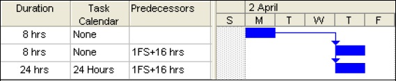Note: Microsoft Project 2000 uses the Project Calendar to calculate lags, therefore files may calculate differently in 2000 from later versions. The example below is the file from the picture above and opened in Microsoft Project 2000: