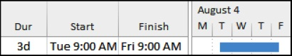 When these times are not aligned then tasks may be displayed one day longer than their assigned duration. The picture below shows a 3-day task spanning four days because the Calendar start time is 8:00 am and the Default start time is 9:00am. These times are set in the Project Options form, Schedule tab which may be accessed by: